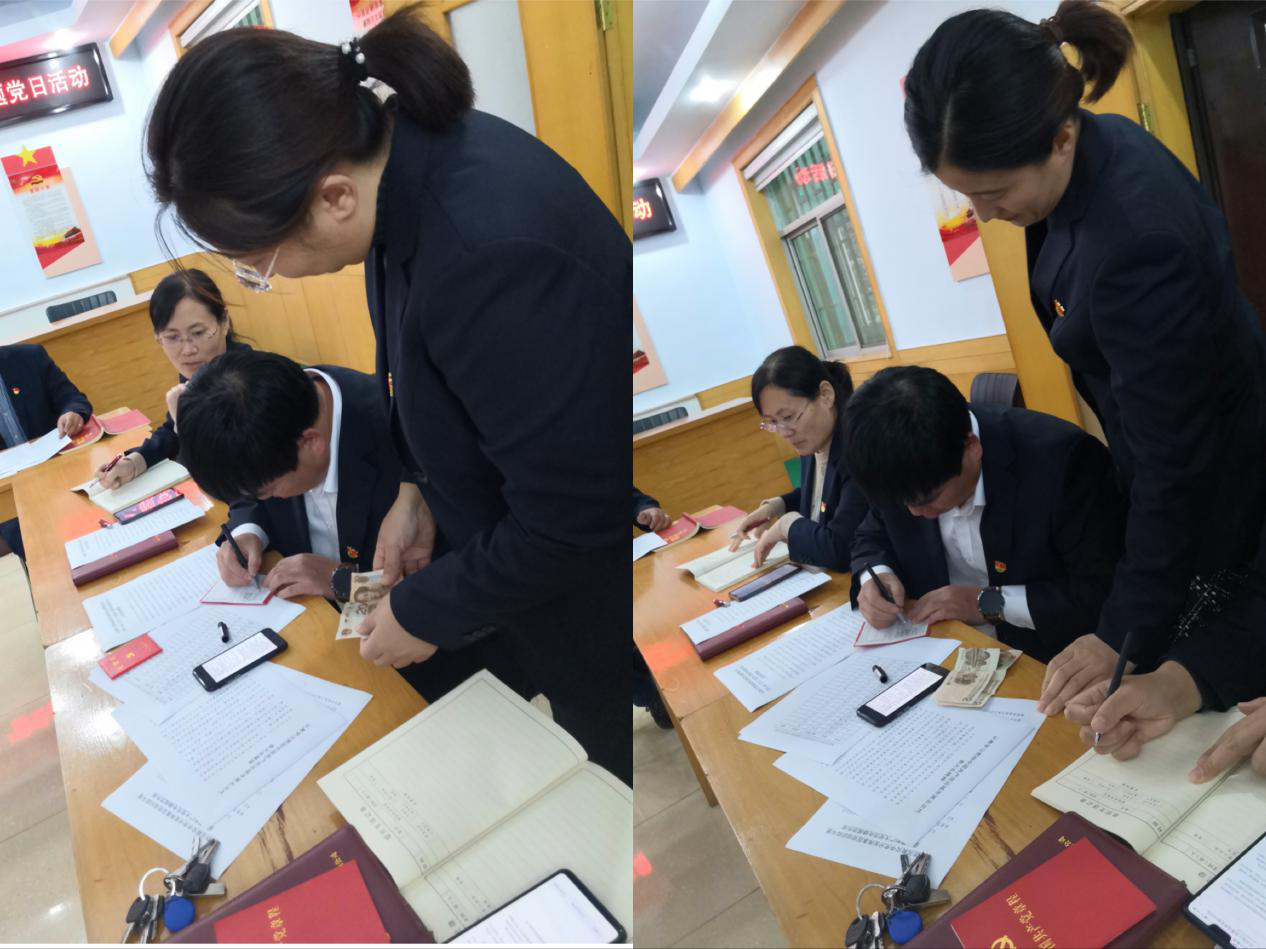 首先,全體黨員逐個(gè)向支部繳納了本月黨費(fèi),并進(jìn)行了黨費(fèi)收繳臺賬登記。
