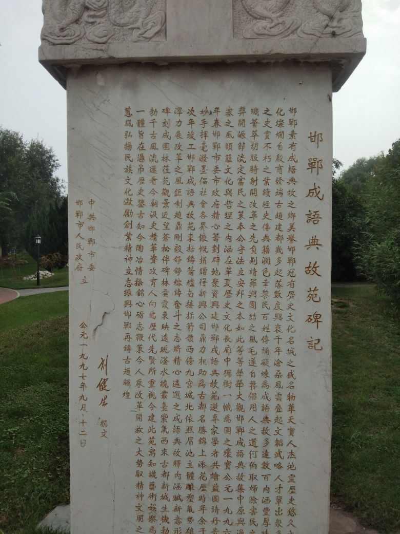 邯鄲成語典故苑位于河北省邯鄲市西北部趙苑公園內(nèi),建于1996年,是邯鄲市委、市政府為弘揚邯鄲歷史文化而建的,具有豐富文化底蘊和園林特色。據(jù)專家統(tǒng)計,與邯鄲有關(guān)的成語典故共有1584條。2005年10月26日,邯鄲市被授予“中國成語典故之都”稱號。
