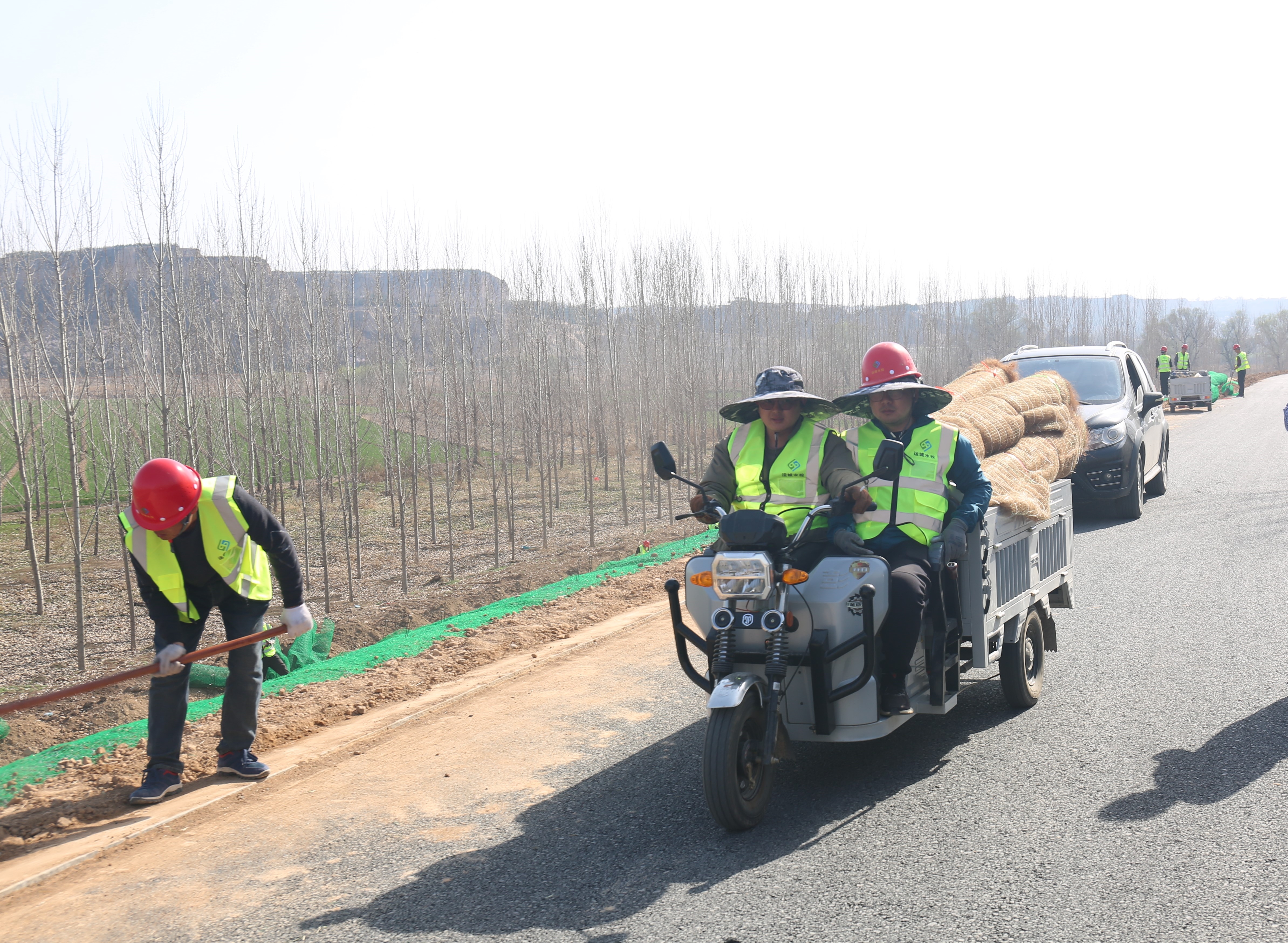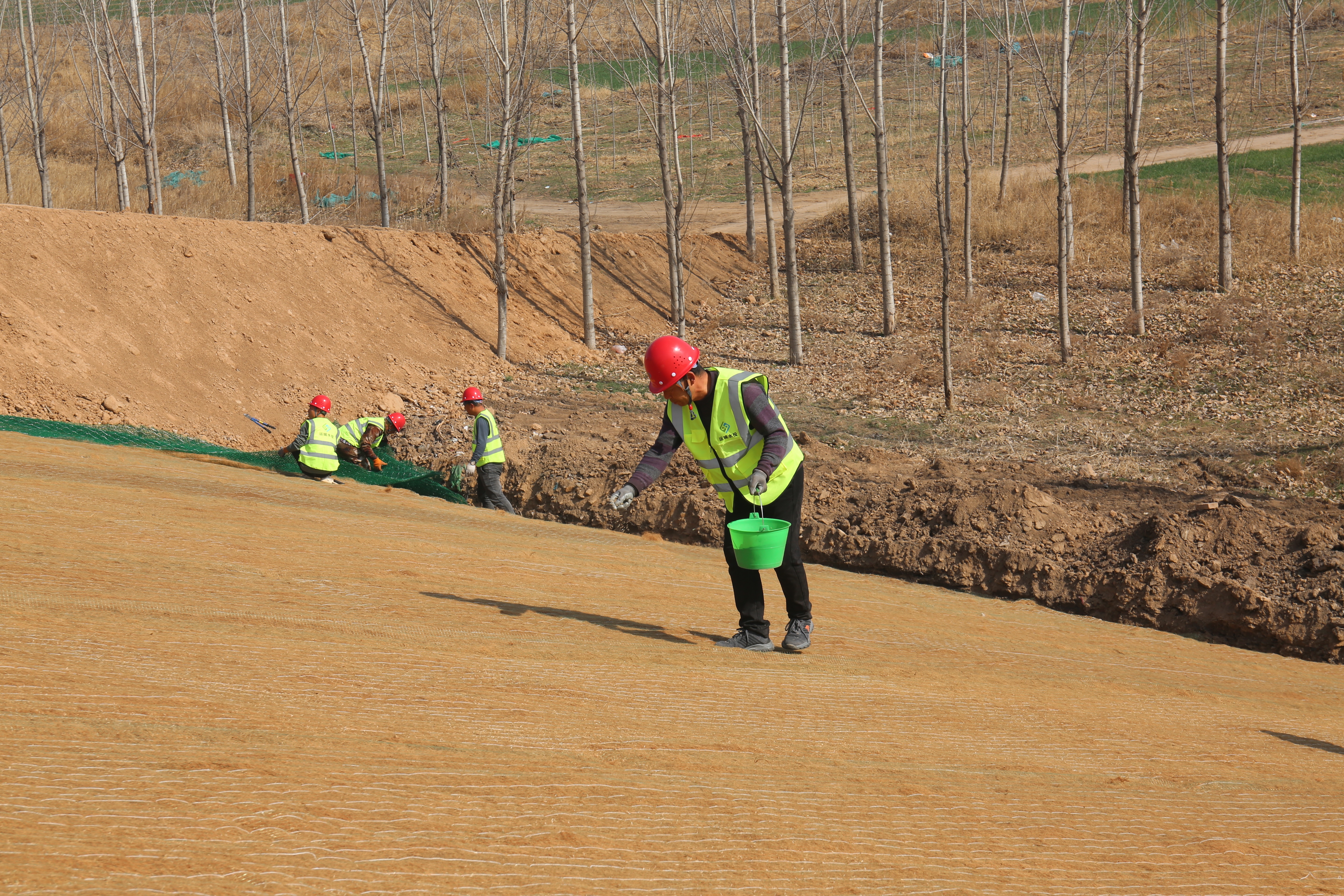 施工現(xiàn)場(chǎng),工程機(jī)械、運(yùn)輸車輛、施工人員正在加緊作業(yè)。一片片椰絲毯經(jīng)過清除坡面雜物、坡度整修、開挖坑槽、播撒草籽等八道程序才能完好鋪設(shè)在大壩上。椰絲毯是一種新型環(huán)保材料,具有良好的吸水性、保濕性和透氣性,這種環(huán)保材料既可以起到穩(wěn)固河道邊坡、防止河岸沖刷破壞的作用,同時(shí)還能優(yōu)化生態(tài)環(huán)境。